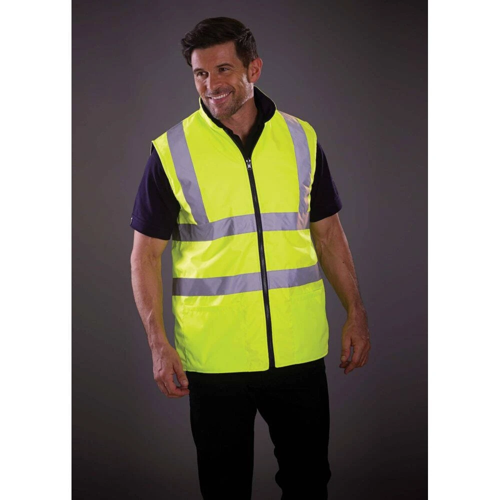 Ce gilet est en 100% polyester avec un revêtement PU imperméable. L’intérieur de ce gilet est en 100% polyester (polaire) antiboulochage. Il est muni d’un zip sur toute la longueur jusqu’au menton et de 2 poches réchauffe-mains de chaque côté. Accès pour la broderie.