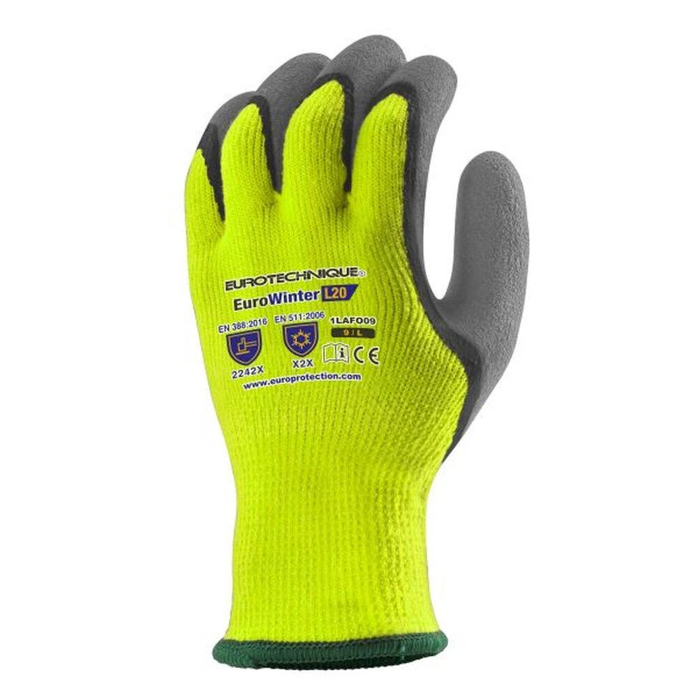Ces gants anti-froid haute visibilité Eurotechnique Eurowinter L20 possèdent une enduction à la paume et au pouce en mousse de latex gris effet « grainé ». Ils vous apporte une protection contre le froid ainsi que confort et résistent à la déchirure. Idéal pour les travaux de manutentions moyennes et lourdes en environnement froid ( maintenance, collectivités, entreposage, etc). Vendus par lot de 5 paires de gants.