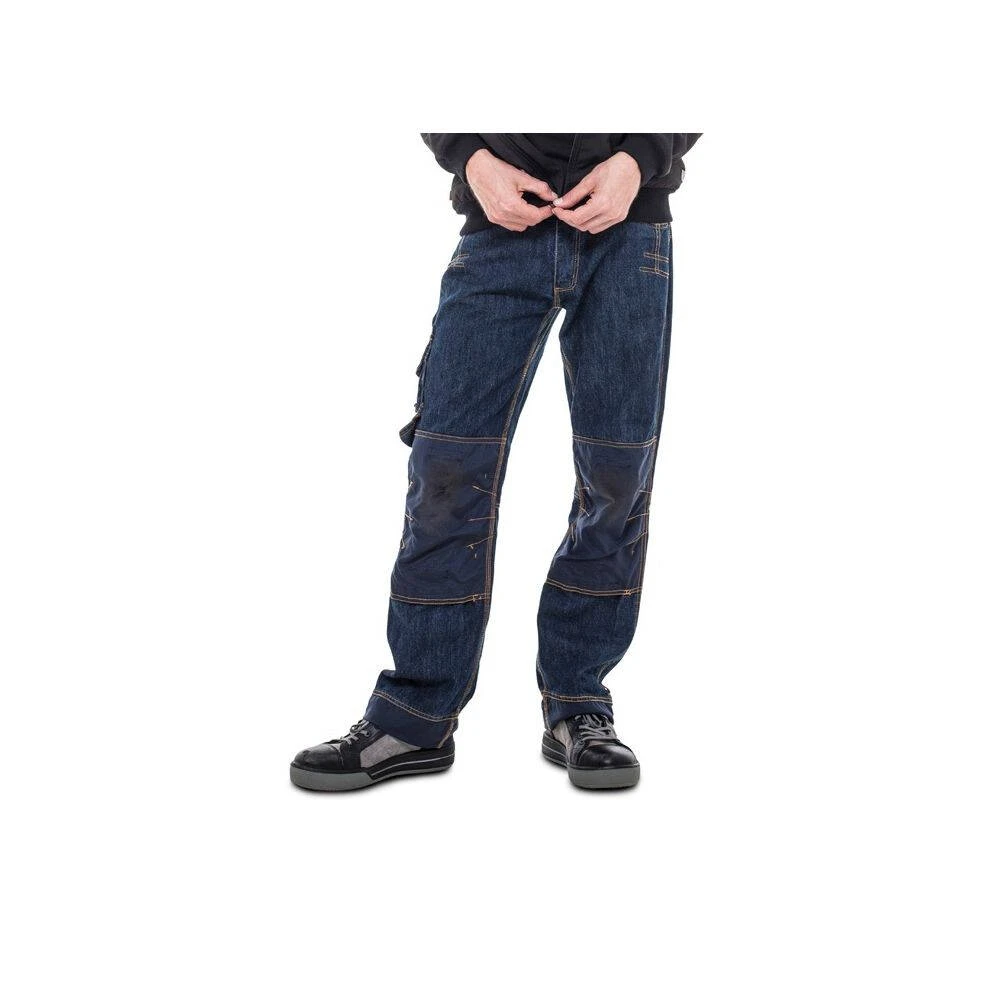 Un jean de travail multipoches 100% coton bleu avec poches pour genouillères et refort genoux.