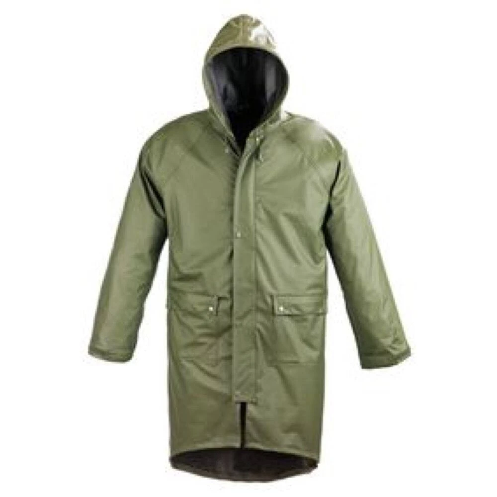 Ce manteau de pluie Coverguad en PU a un col à capuche, un serrage capuche, une fermeture à glissière simple, des manches terminées par bandes agripantes ainsi que 2 poches externes basses avec rabat. Ce vêtement normée EN 343 vous protègera efficacement de la pluie et des projection d’eau.