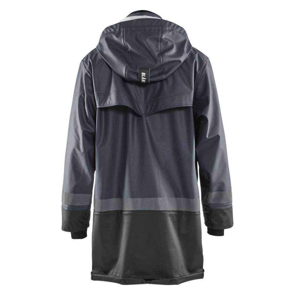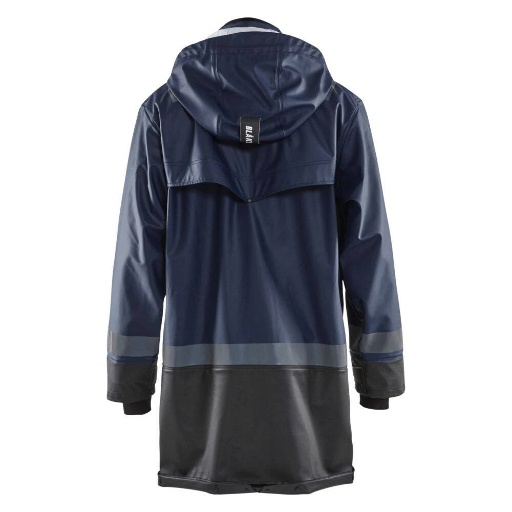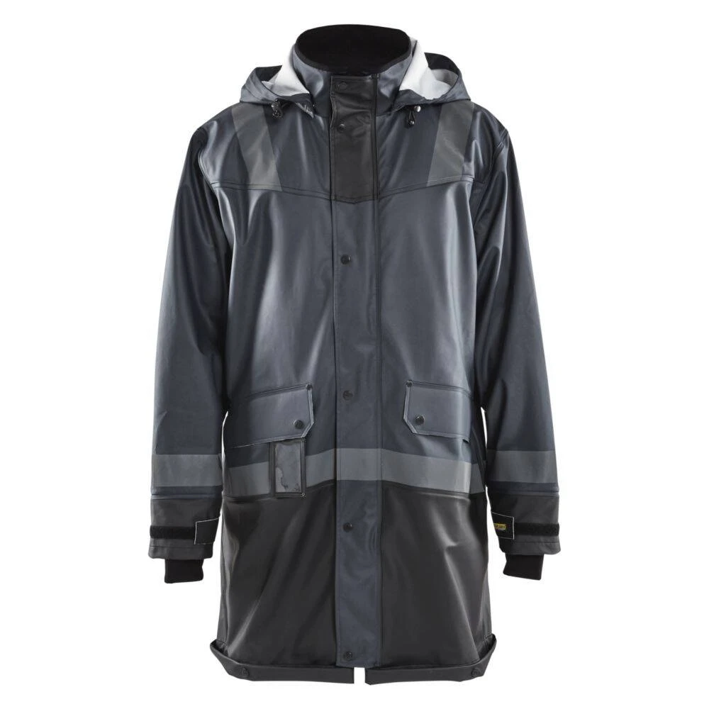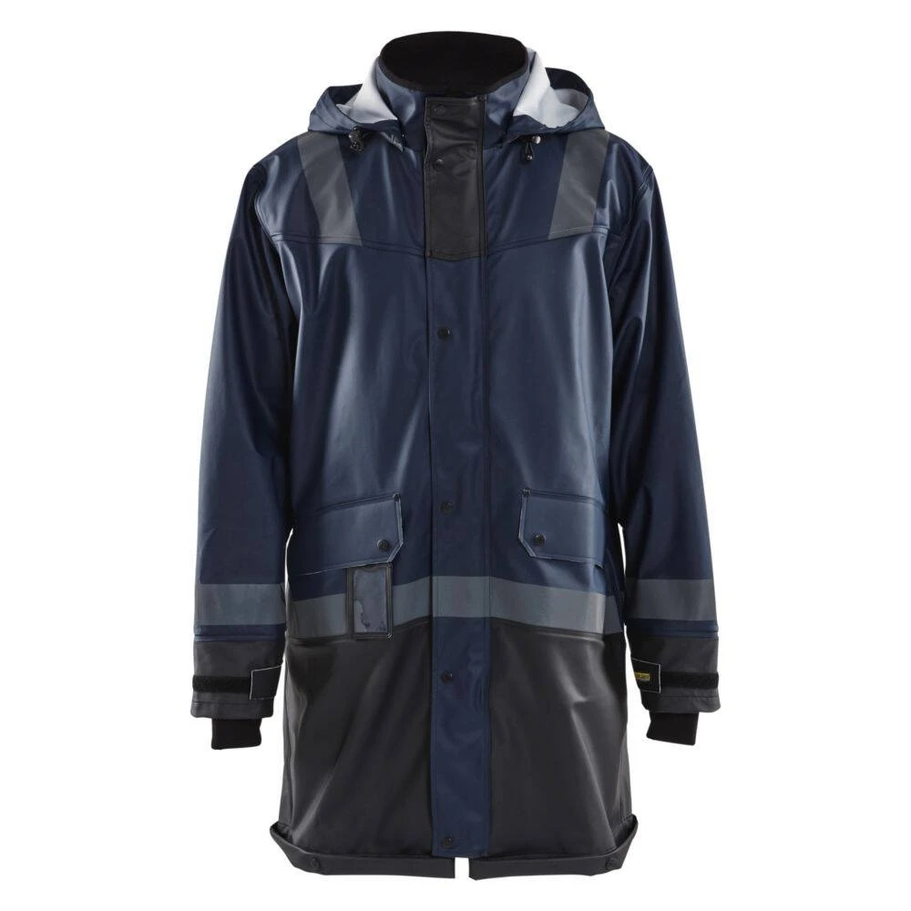 Le manteau de pluie étanche Blaklader NIVEAU 2 a été conçu pour une protection efficace contre l’humidité et les intempéries. Grâce à un tissu souple en polyester enduit de PU, ce manteau est cousu par thermosoudure afin d’offrir une étanchéité complète et garder au sec son porteur ( manteau normée EN 343). Doté d’un col doublé en molleton, d’une fermeture zip à rabat par pressions, il assure une isolation thermique parfaite et l’aération à l’arrière garantit une meilleure respirabilité. Avec ses divers détails fonctionnels, ce manteau offre un confort unique sur le terrain grâce à sa capuche amovible réglable, ses manches ajustables par velcro munies de manchettes internes en néoprène et ses poches de rangement avec rabat pour mettre badges, outils et portable. Enfin, ce manteau dispose de bandes réfléchissantes sur le corps, les manches et les bras, vous permettant d’être plus visibles par faible luminosté.