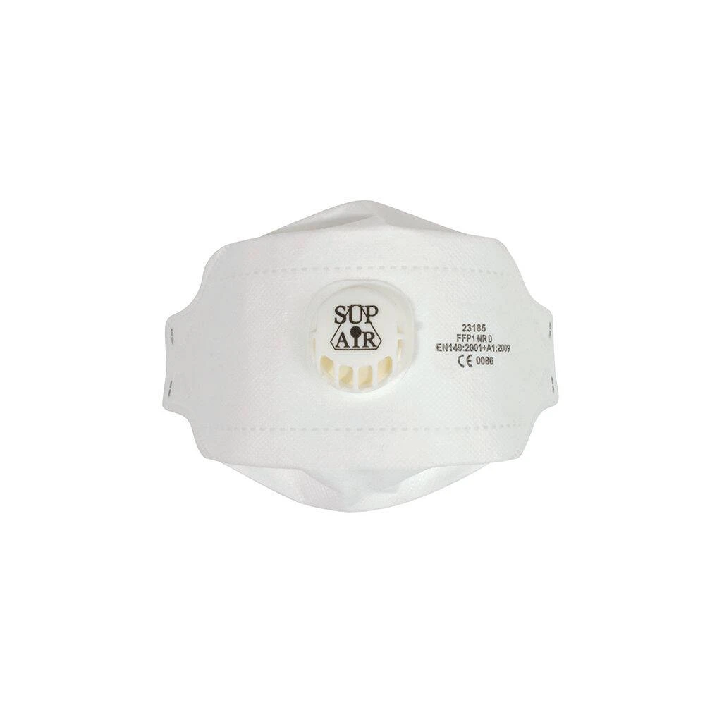 Ce masque respiratoire pliable 3D à usage unique à valve Sup Air FFP1 NR D protège des aérosols solides et liquides non toxiques comme par exemple le carbonate de calcium, le kaolin, le ciment, la cellulose, le soufre, le coton, la farine, le charbon, les métaux ferreux, les huiles végétales et les bois tendres. Domaines d’utilisation : Industrie textile, artisanat, métallurgie, exploitation minière, travaux publics souterrains, menuiserie, ébénisterie (bois durs exceptés). Il est vendu par boîte de 20 masques.