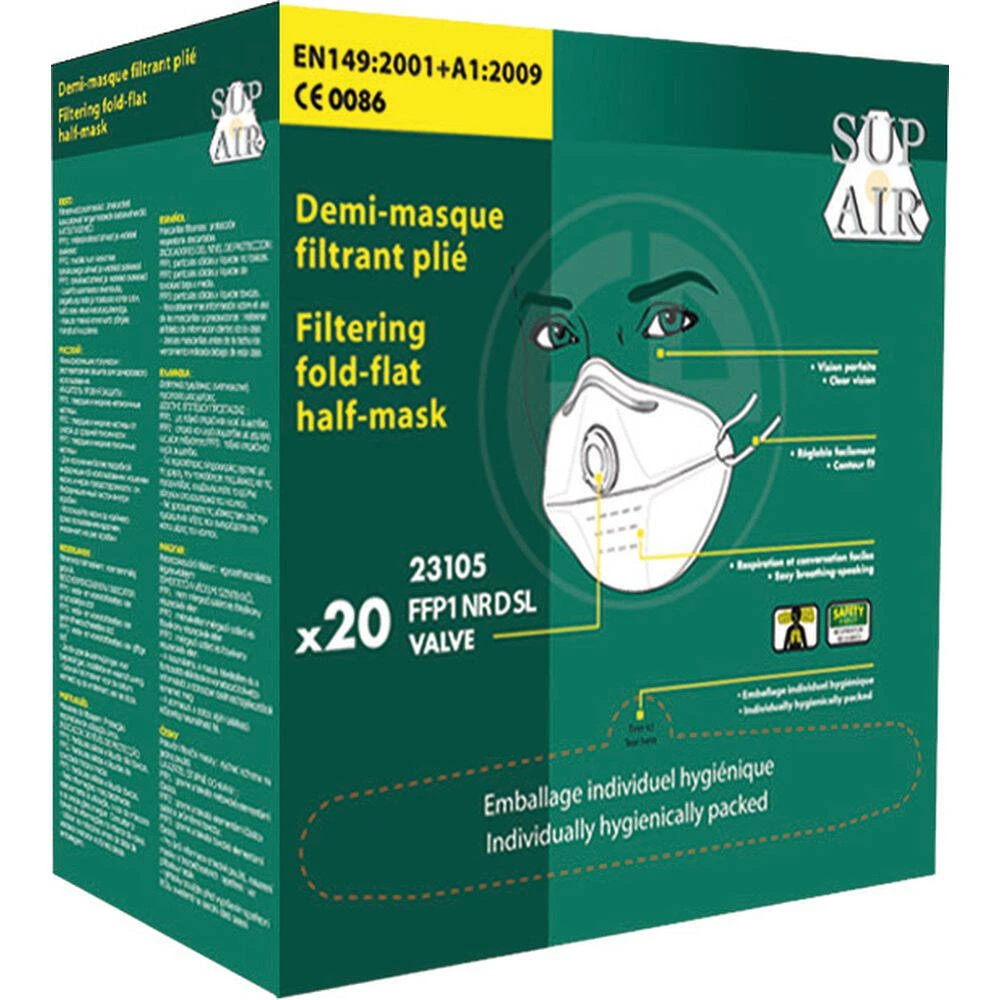 Ce masque pliable à usage unique FFP1 D SL Sup Air dispose d’une valve et d’un clip nasal, et ne comporte pas de partie métallique apparente. Il assure au porteur une protection contre les aérosols solides non toxiques et liquides pour des concentrations jusqu’à 4 fois la VME. Domaines d’utilisation : Industrie textile, artisanat, métallurgie, exploitation minière, travaux publics souterrains, menuiserie, ébénisterie (bois durs exceptés). Il répond aux normes EN149 : 2001+A1:2009, FFP1, D, et SL. Il est vendu par boîte de 20 masques.