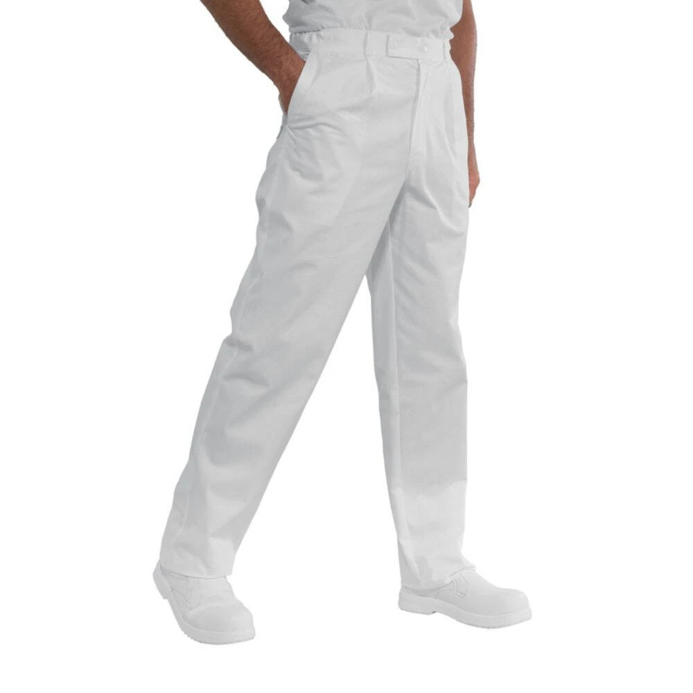 Ce modèle de pantalon de travail blanc Isacco Lavoro est un modèle destiné à une utilisation en cuisine, agro alimentaire ou dans le secteur médical (laboratoire, clinique, cabinet médical, etc.). Fabriqué à partir d’un tissu 100% coton durable et confortable, ce pantalon dispose d’un fermeture bouton, de deux poches côté et d’un poche arrière. Idéal pour le personnel à la recherche d’un pantalon de travail blanc fiable, agréable à porter et facile à entretenir.
