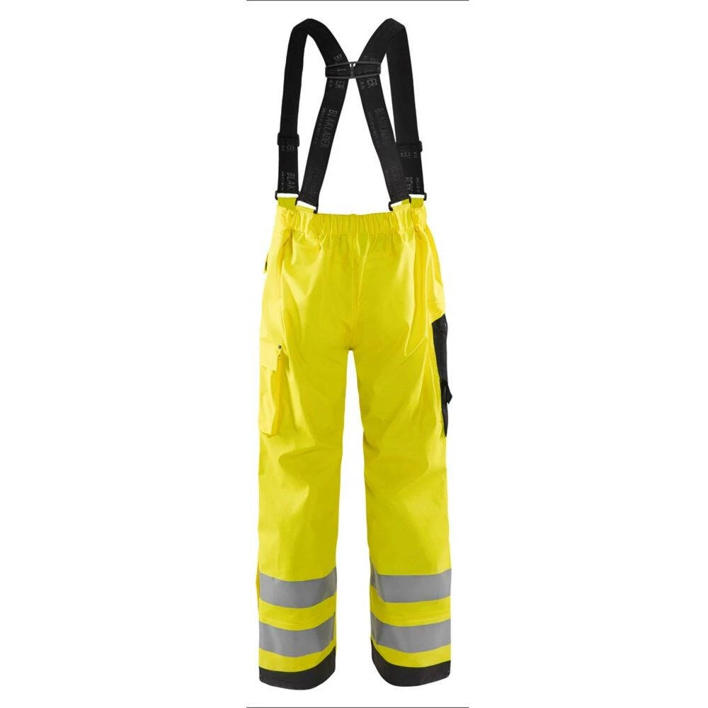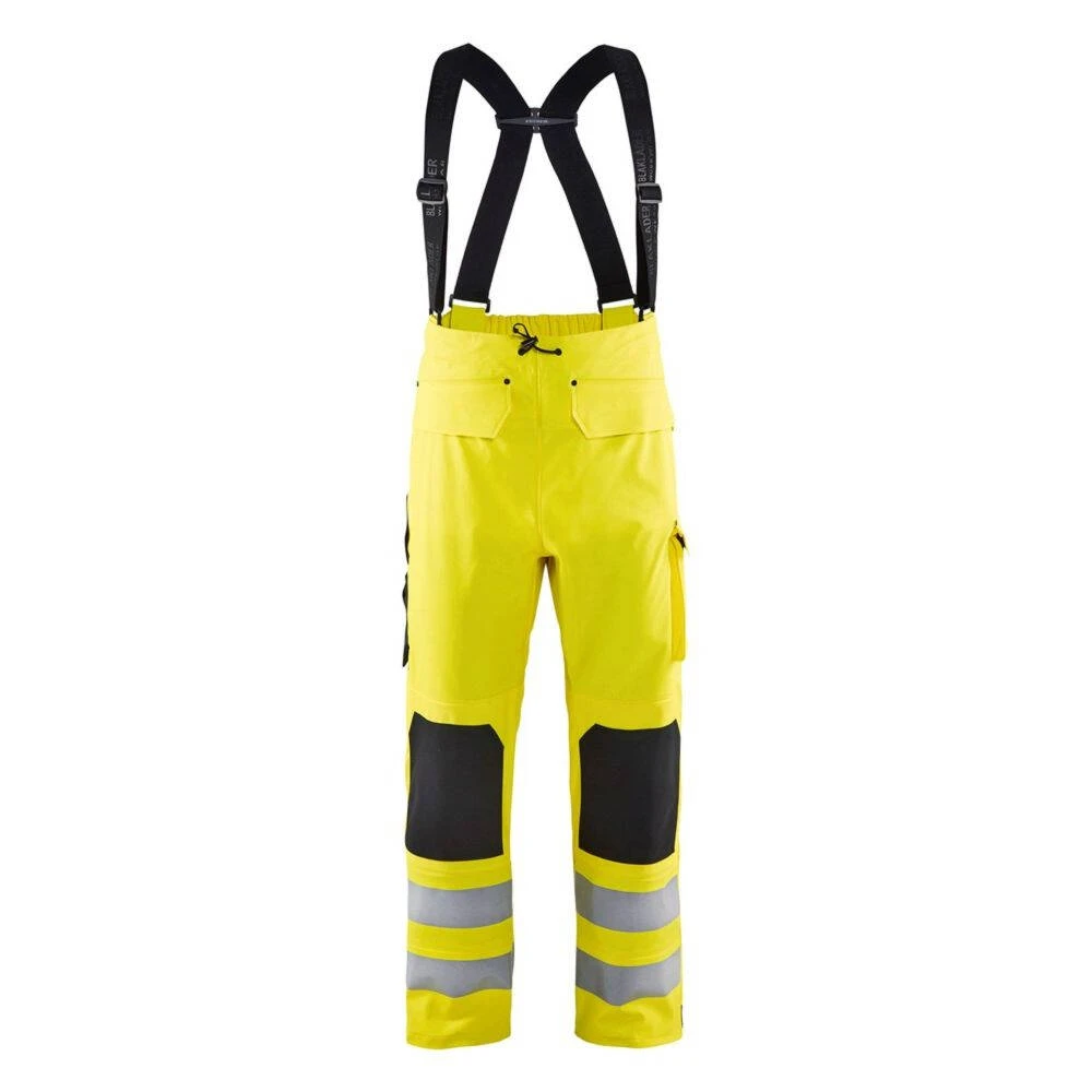 Le pantalon de pluie à bretelles haute visibilité Blaklader NIVEAU 3 est un sur-pantalon imperméable pour travailler confortablement en saison des pluies. Un vêtement fonctionnel avec des bas de jambes ajustables avec boutons pouvant être enfilé facilement. Conçu en polyester enduit de polyuréthane, il est parfaitement étanche et offre une excellente résistance au vent (pantalon normé EN343). Le tissu respirant, les bretelles ajustables et la taille élastique assurent le confort du porteur en offrant une mobilité maximale. Pour l’aspect pratique, il dispose de plusieurs poches à rangement pour outils, couteau, stylo. Ce pantalon garantit résistance et durabilité grâce au renfort sur les genoux. Enfin, ce pantalon dispose de bandes réflechissantes en bas de jambe vous permettant d’être plus visible de tous en cas de faible luminosité, par mauvais temps ou sur des chantiers à risques ( bord de route, etc.).