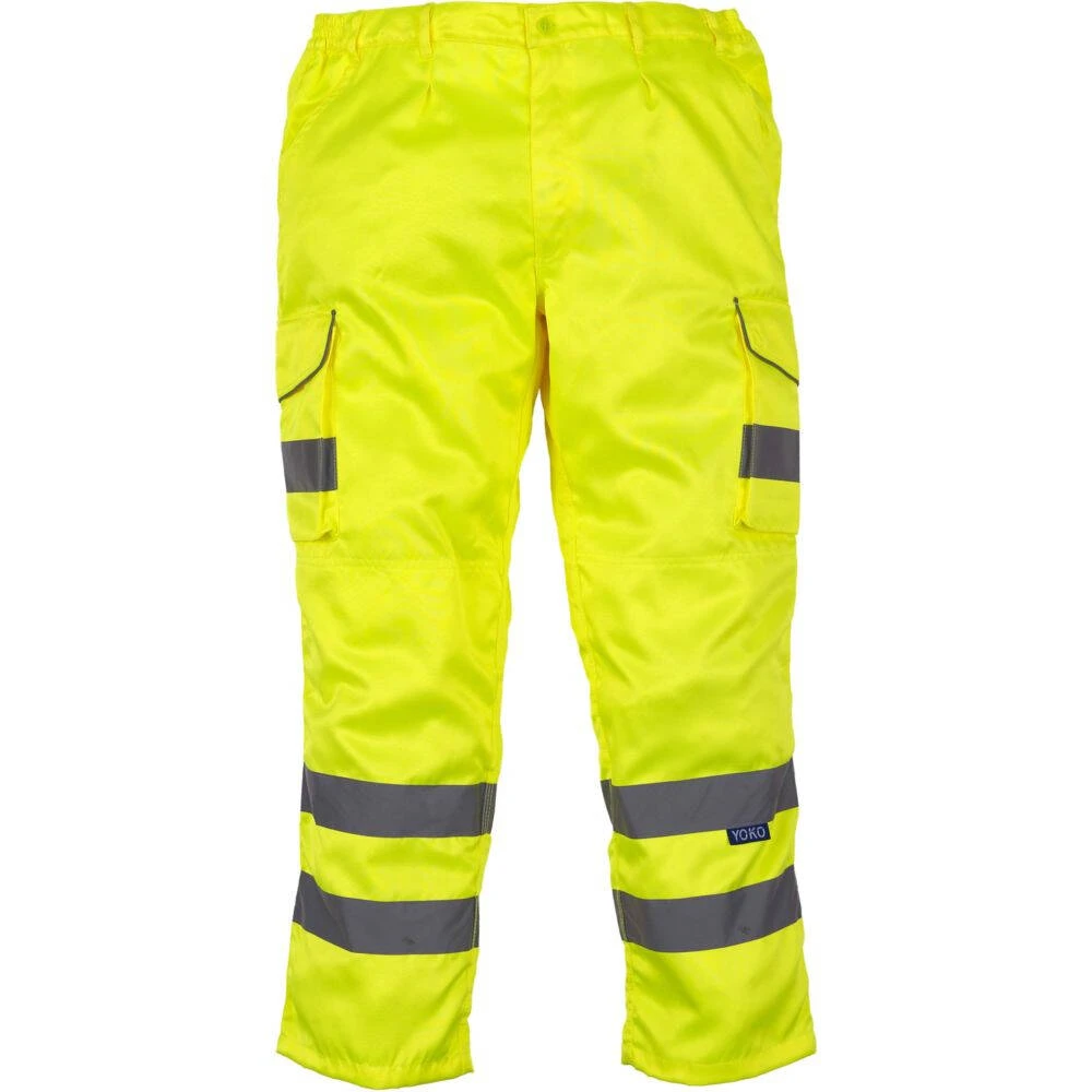Le pantalon Cargo haute visibilité Yoko est en 80% polyester / 20% coton avec traitement déperlant longue durée. Avec 2 bandes réfléchissantes 3M (largeur 5 cm) sur le bas de jambe, 2 poches cargo avec bande réfléchissante et finitions réfléchissantes, poches genouillères avec fermeture invisible et une poche boutonnée à l’arrière.