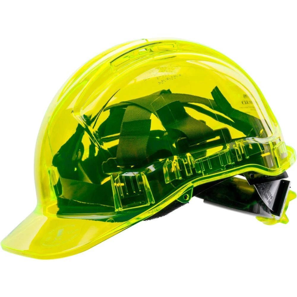 Le casque Peak View Plus à crémaillère Portwest est un modèle exclusif Portwest et breveté. Le casque entièrement translucide permet au porteur de regarder vers le haut ou sur les côtés sans avoir besoin d’incliner la tête. La coque en polycarbonate ultra solide et ultra légère offre une protection contre les rayons UV 400. Les autres caractéristiques incluent le harnais textile de 6 points, l’ajustement par crémaillère. Ce modèle est non ventilé pour empêcher la pénétration de la poussière, la saleté et l’eau.