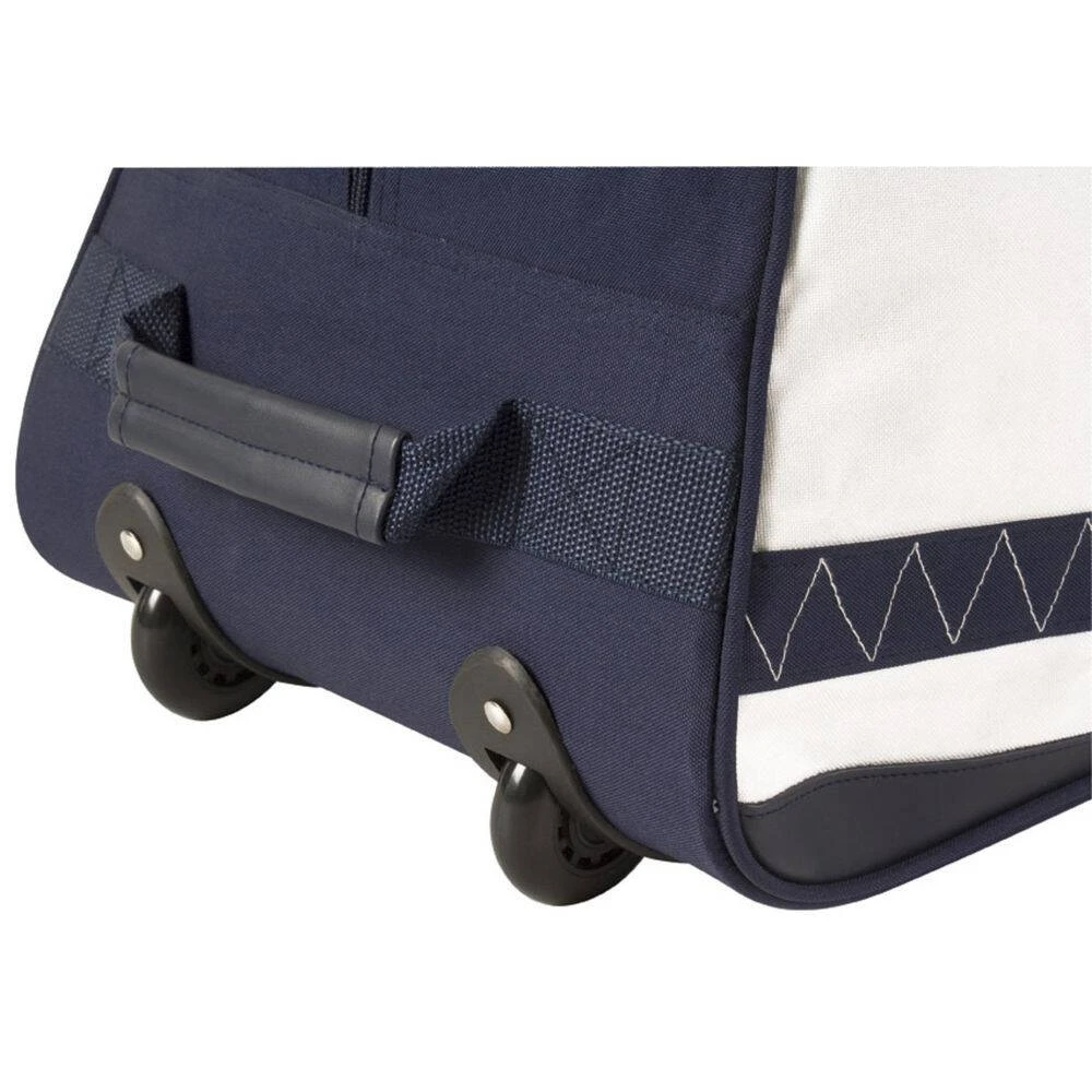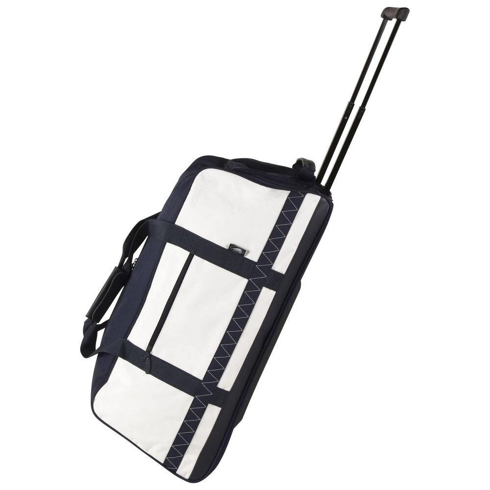 Le sac de voyage à roulettes Trolley de la marque Pen Duick vous accompagnera lors de tous vos déplacements ! Grâce à sa poignée télescopique et amovible, vous pourrez déplacer votre sac de voyage facilement et aisément sans devoir le porter et ainsi vous faire mal au dos. La poignée est dissimulable lorsque vous ne souhaitez plus l’utiliser en sac à roulettes pour plus de praticité et plus de design. Il dispose d’un compartiment extérieur zippé spécialement conçu pour les chaussures, vous gardez ainsi vos chaussures séparées de vos vêtements ou de vos affaires et vous garantissez des affaires qui restent propres et qui ne s’abîment pas. Il dispose de nombreuses poches pour que vous puissiez ranger vos affaires comme bon vous semble. Son coloris blanc et navy lui donne un look incomparable et original. Ses décorations avec coutures « zigzag » lui donne un effet encore plus agréable. Composé en 100% polyester oxford 600D.