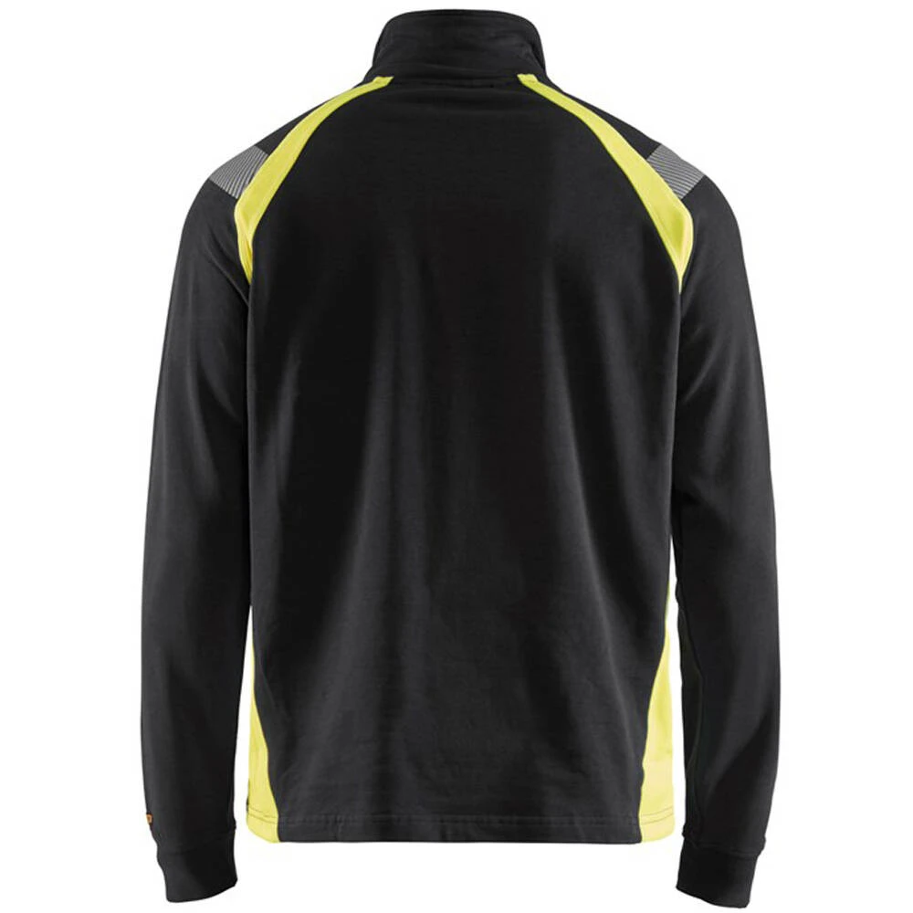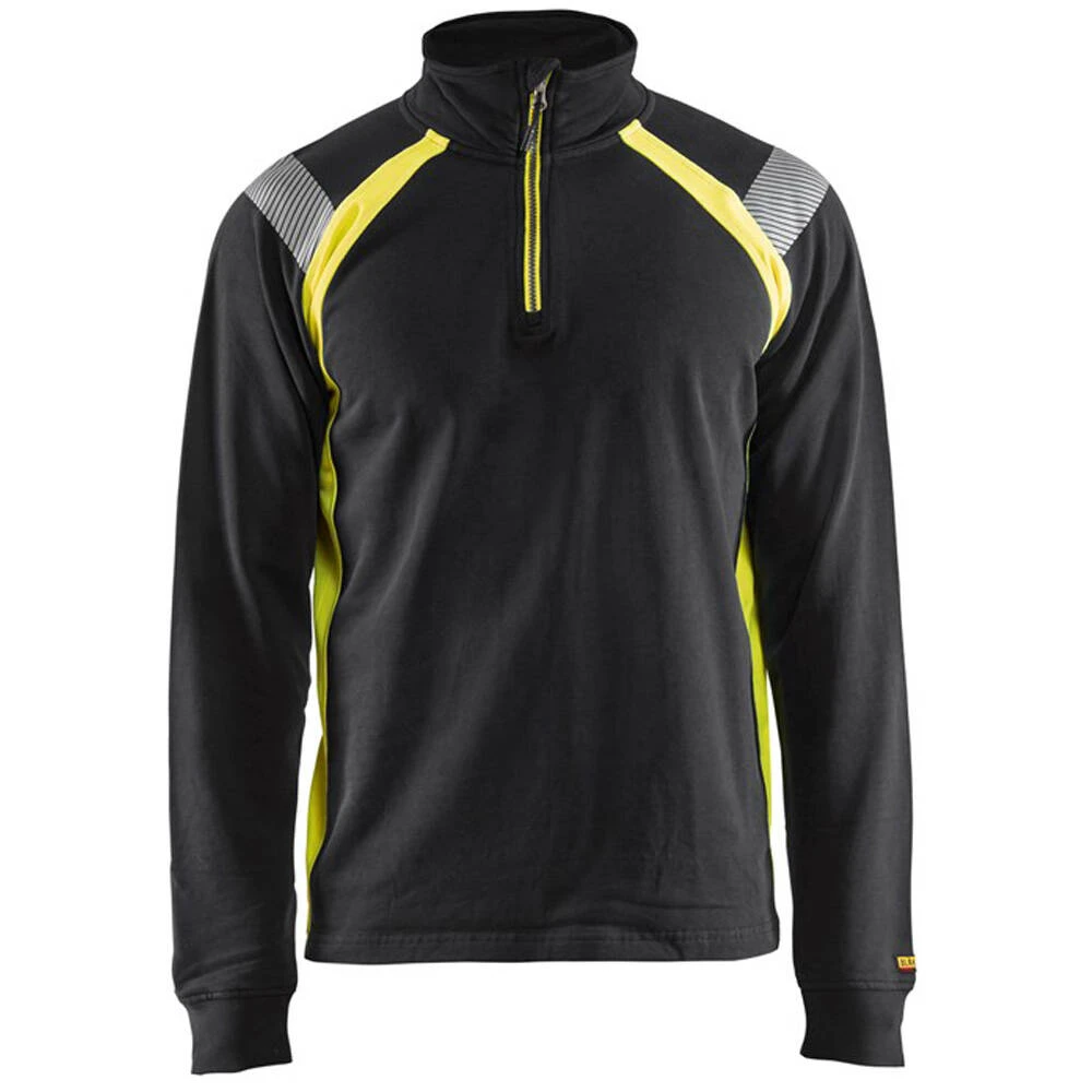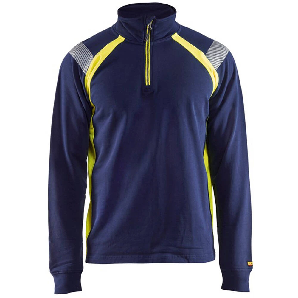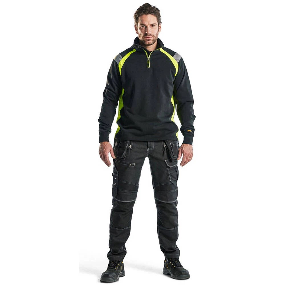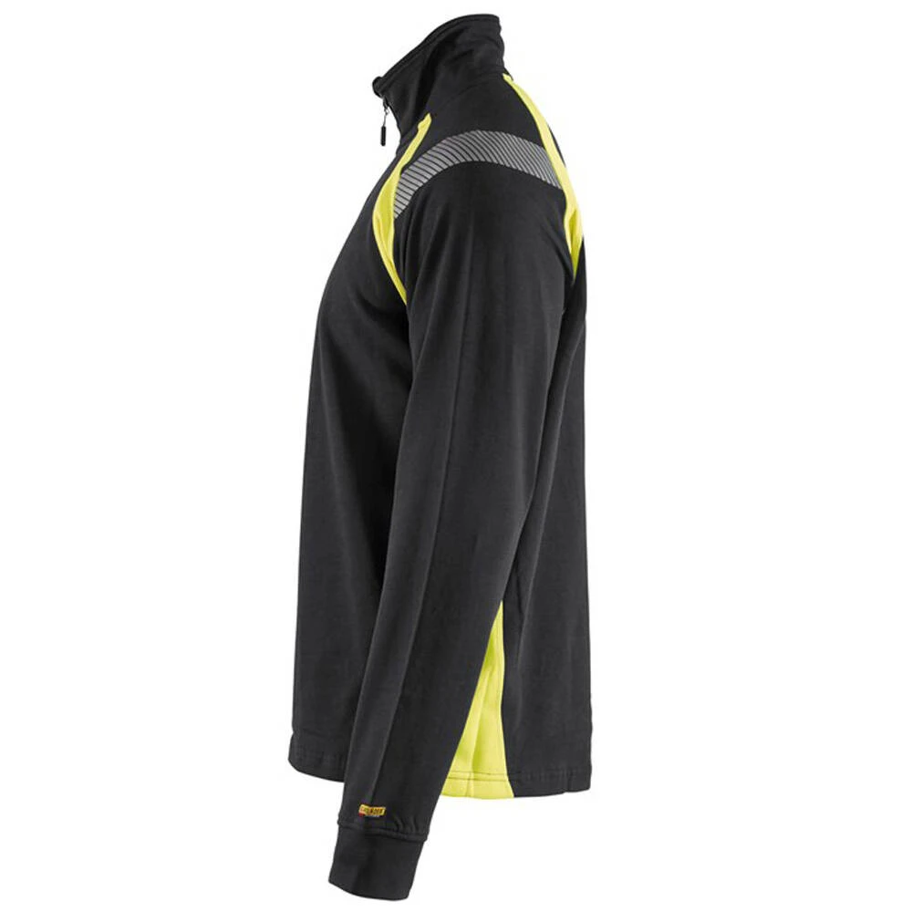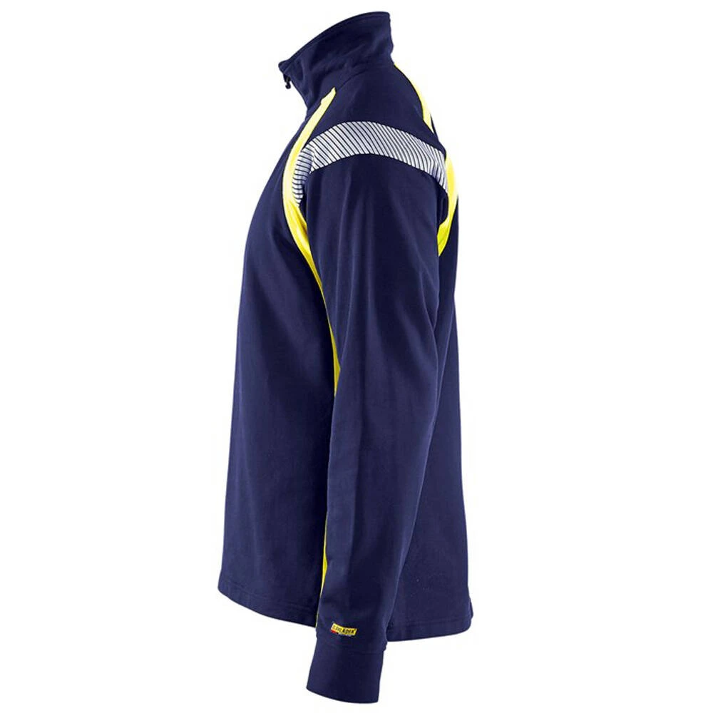 Le sweat col camionneur haute visibilité Blaklader est avec col haut et fermeture zippée. Le sweatshirt a des poignets tricotés et un panneau arrière étendu. Il possède des détails réfléchissants et du tissu fluorescent pour une visibilité augmentée. De fabrication 100% coton, c’est un vêtement à la fois durable et doux.