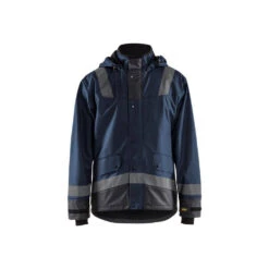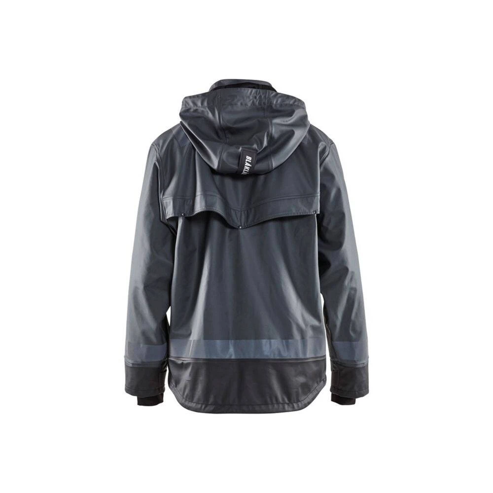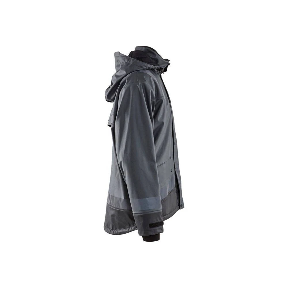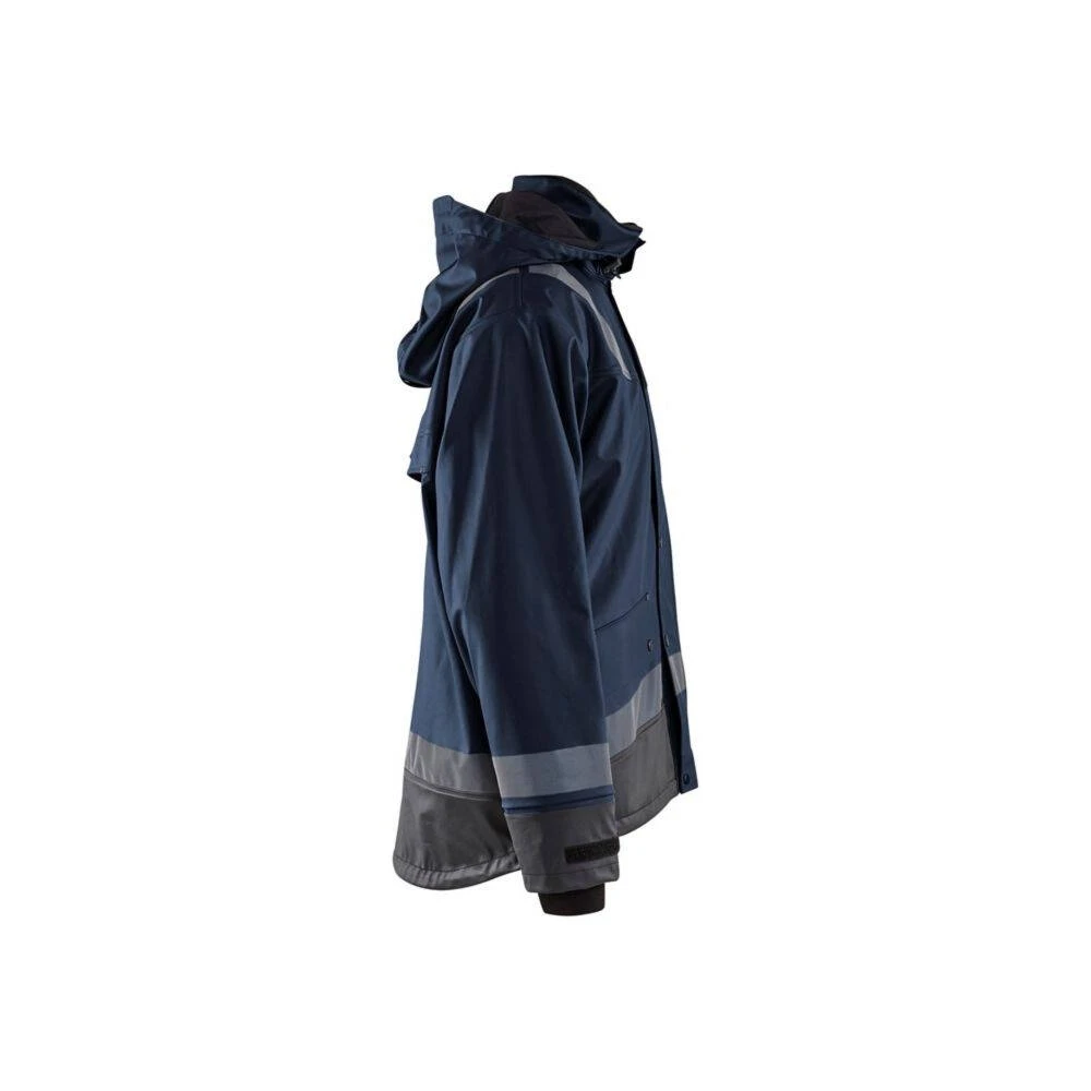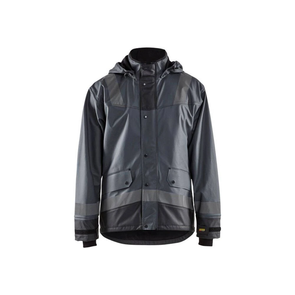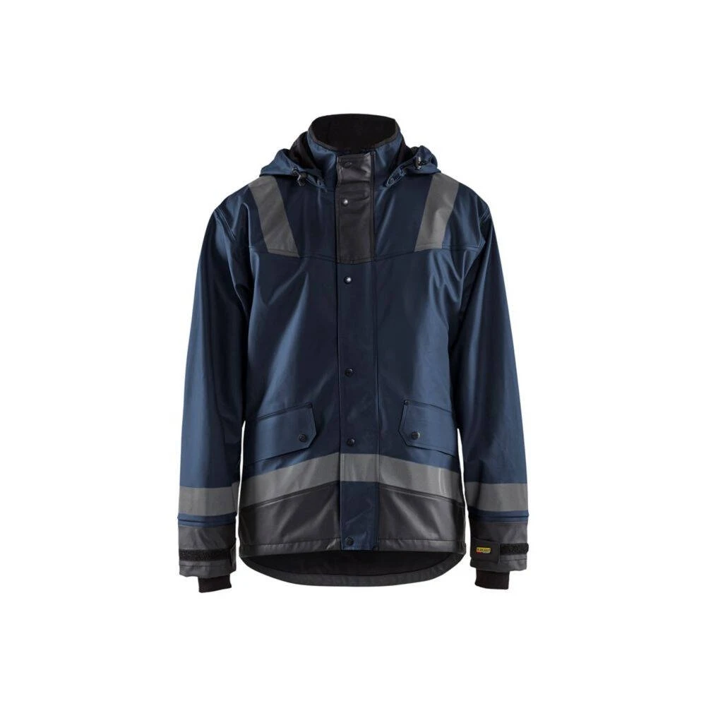 La veste de pluie Blaklader BANDES REFLECHISSANTES est confectionnée en matériaux à haute performance pour faire face aux intempéries. Le tissu extérieur est en polyester enduit de PU pour une excellente imperméabilité (veste normée EN343). Cette veste coupe-vent dispose d’une capuche amovible avec une fermeture zip jusqu’au col avec rabat à pression et des manches ajustables munies d’intérieur en néoprène qui permet de garder au chaud et au sec son porteur. L’aération dans le dos assure une bonne respirabilité. Pour l’aspect pratique, elle est dotée de diverses poches de rangement. L’extension en bas du dos et le serrage bas par cordon garantissent une aisance parfaite et les bandes réfléchissantes sur les manches et les épaules permettent d’être plus visibles dans l’obscurité, par mauvais temps, ou sur des chantiers à risques.