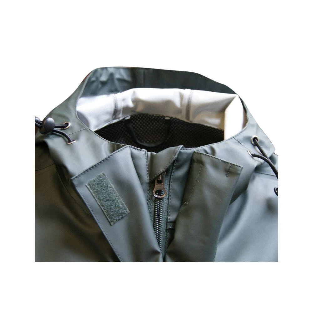 Veste de pluie imperméable LMA, coutures thermosoudées étanches, tissu et poignets coupe-vent, passepoiles rétro-réfléchissants. Norme EN343 (imperméable) et EN13688. Tissu 100% polyester, enduction polyuréthane / PVC (étanchéité 5000mm).