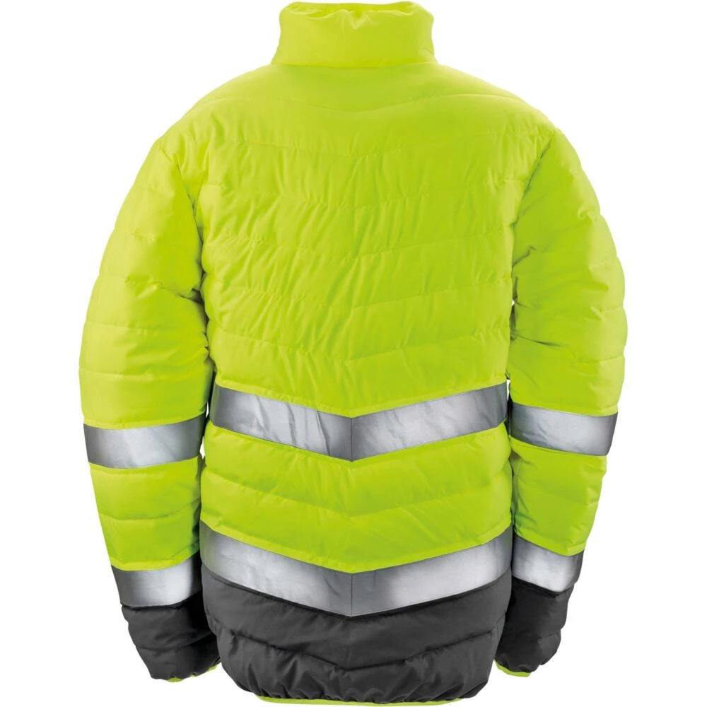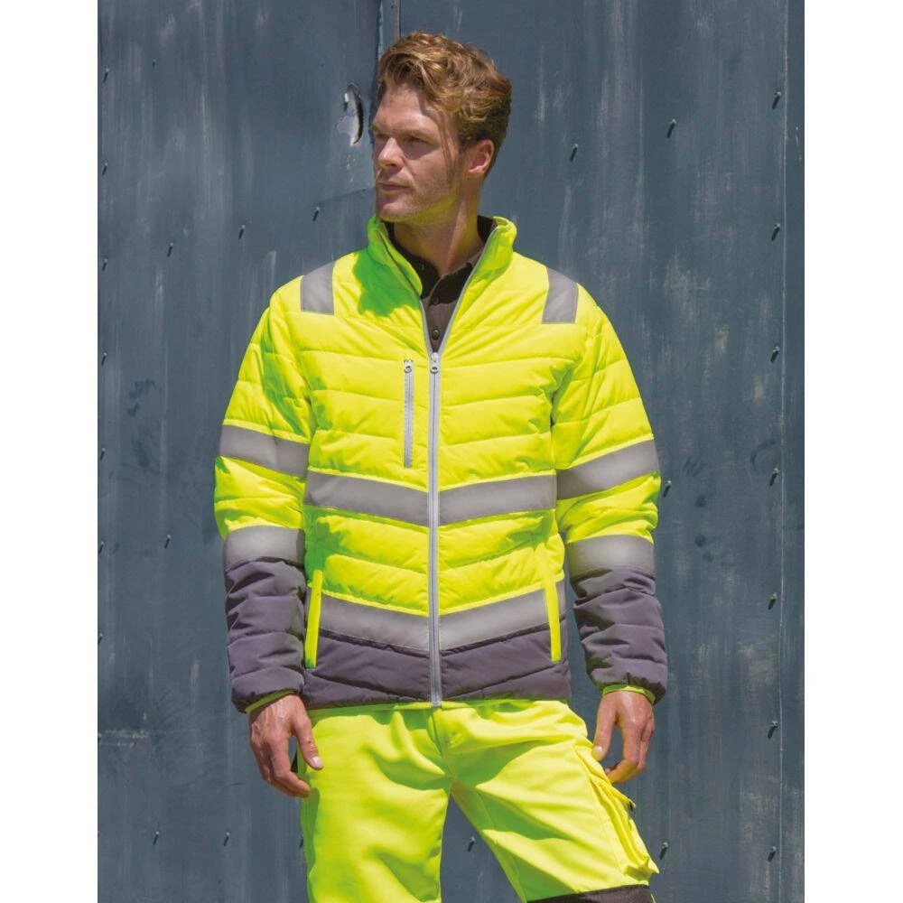 La veste haute visibilité Result toucher doux est 100% polyester 75D avec stretch mécanique / membrane TPU avec un col montant et dos plus long, une fermeture zippée YKK©, une doublure intérieure et finitions de couleur grise. Cette veste chaude dispose également d’un empiècement de couleur foncée en bas de vêtement pour masquer les traces de salissures, une bandes avec imprimé réfléchissant sur les épaules, le corps et les manches, un biais de finition souple aux poignets et bas de vêtement.